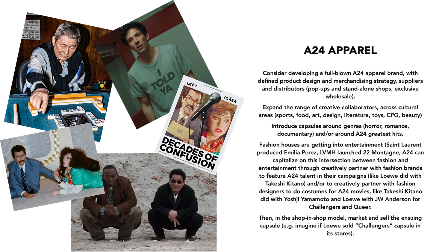 “All forms of storytelling” is the operative phrase here. An idea can exist as a fashion item but also as a movie or a TV show, an art installation, or a hospitality experience. It’s not hard to imagine a movie released together with a corresponding apparel or sports collection. Or a studio owning fashion or sports brands.