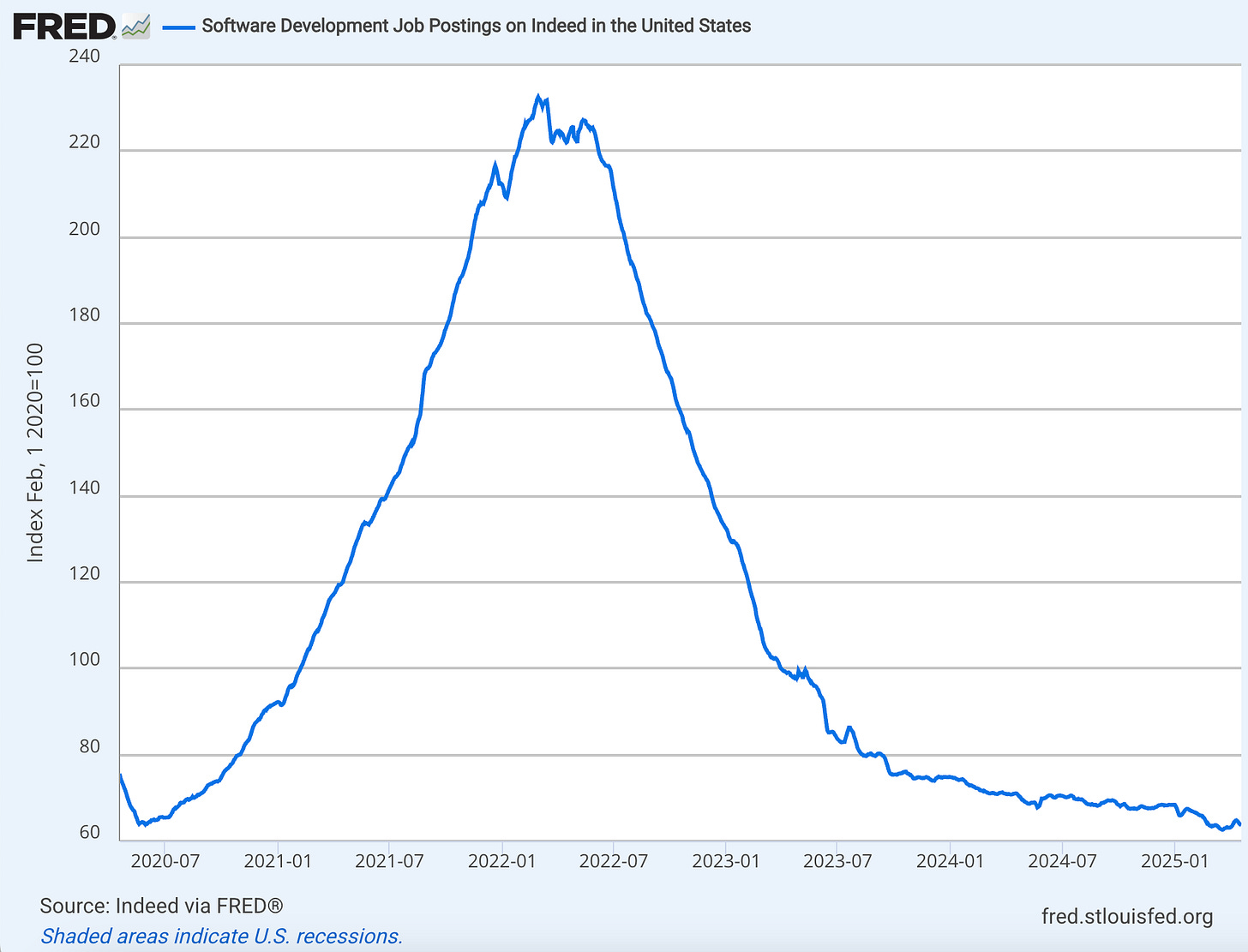 Sharp drop in US software dev job postings since the 2022 peak. But it might not just reflect a slowdown; it could also be about how and where companies are hiring. AI is speeding up development, so teams don’t need to be as big. More companies are hiring globally, using contractors, or relying on smaller, remote teams. The shape and distribution of demand might be shifting. Just one possible interpretation, but it lines up with how AI and leaner approaches are reshaping early-stage teams.