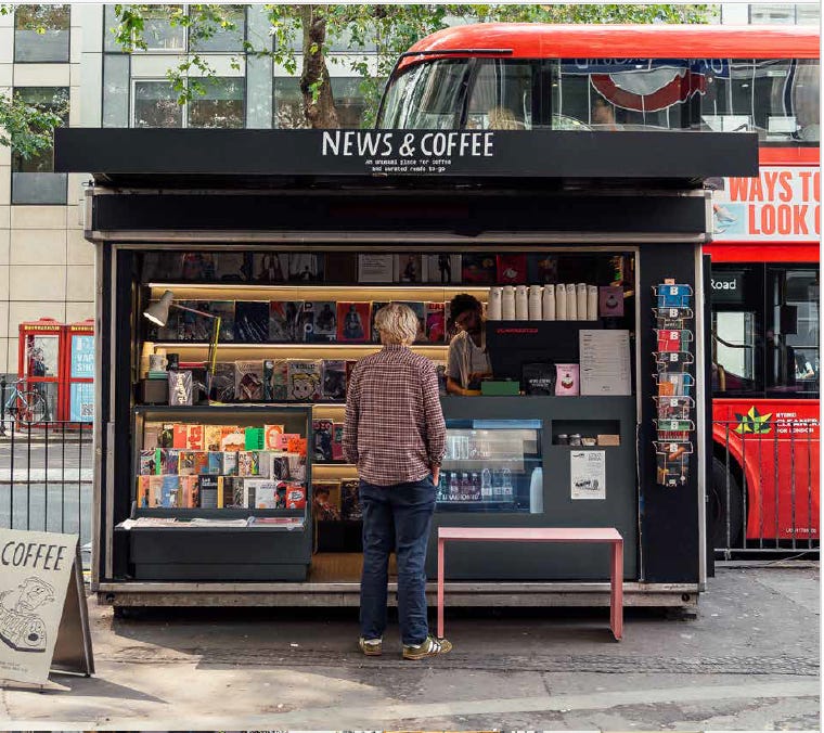 News & Coffee puts up the stand, as they’ve done in the hearts of Valencia, Madrid, Barcelona and —beginning last year — in the redeveloped parts of Kings Cross, a stylish if corporate little tech alley that ends in Granary Square. They partner with authors and create little book launch events. They stamp the book title on coffee cups, and offer it for sale alongside a curated collection of printed matter.