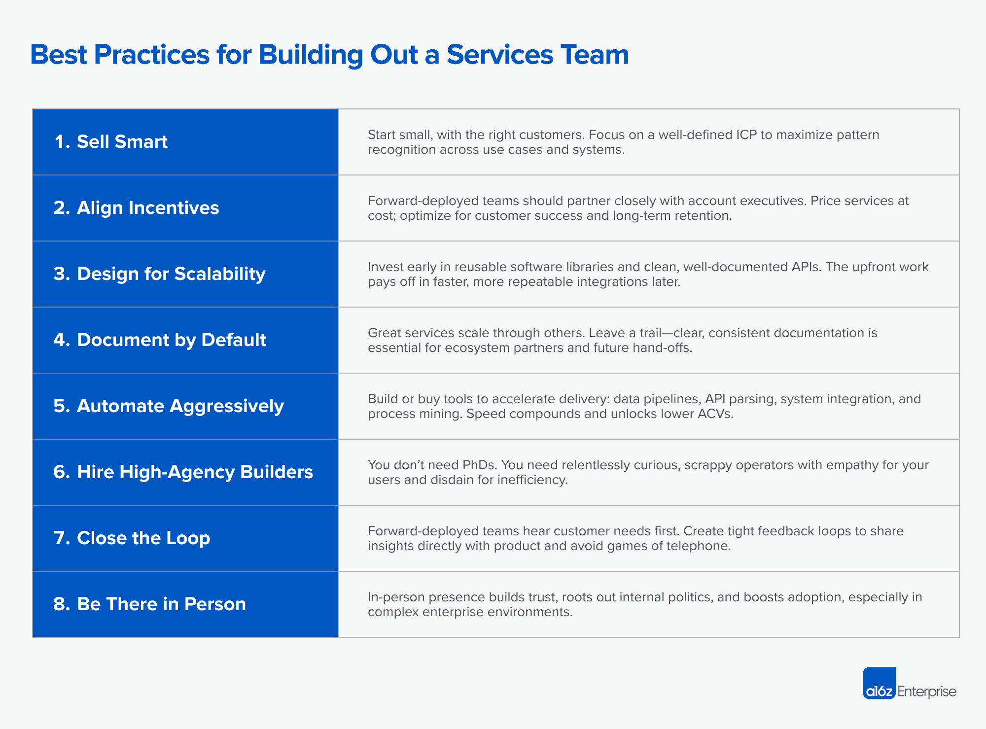 - Build/buy tools to automate: Optimize for maximum speed and scalability in your services motion. This is the major unlock that will enable complex AI application companies to scale faster — and potentially with a lower minimum ACV — than the previous generation. Best-in-class companies are automating as much of the process as possible, including tasks like process mining, data pipeline automation, system integrations, and combing through API documentation. This speed compounds and will create a competitive advantage over time.