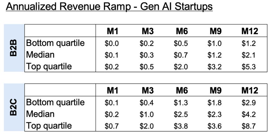 New a16z data validates this disruption thesis. Based on hundreds of AI companies over the past 18 months, consumer AI startups are hitting a median $4.2M ARR in year one, twice the rate of B2B AI companies, and raising Series A rounds within just eight months. What was once considered « best in class » (the $0 to $1M ARR ramp) is now on the lower end of what VCs are seeing.