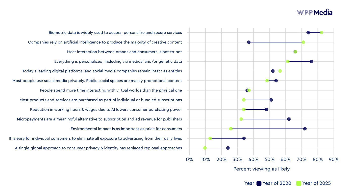While experts still expect significant change by the end of the decade, this latest research reflects the areas in which the most traction appears to have taken hold. Experts currently expect a future where technological integration – particularly involving biometrics and AI assistance – continues its advance but see radical shifts in consumer behavior or global cooperation (the likelihood of a single global privacy law for example) are less likely.