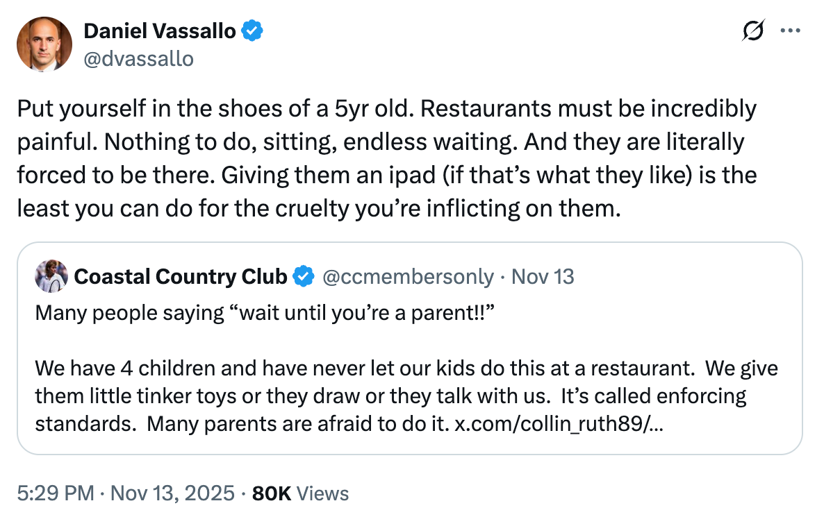 I don’t even like QR code for menu, so I don’t think my view on iPad is difficult to guess. I also treat restaurant as a sanctuary, it is for me the perfect representation of a living microcosm of society, where etiquette, coexistence, community and moral behaviour intersect, making it an ideal environment for children to practice norms and empathy, rather than retreating into a digital distraction.
