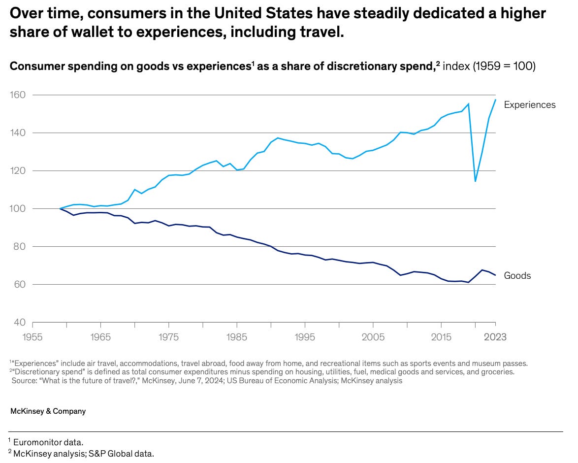 Discretionary spending in the US has been steadily shifting toward experiences over goods since the 1990s (see image) and travel is taking a growing share of wallet, with rising interest in categories like adventure, culinary tourism, wellness, and night-based activities (northern lights, nocturnal safaris…). More than 60% of travelers want to explore lesser-known spots.