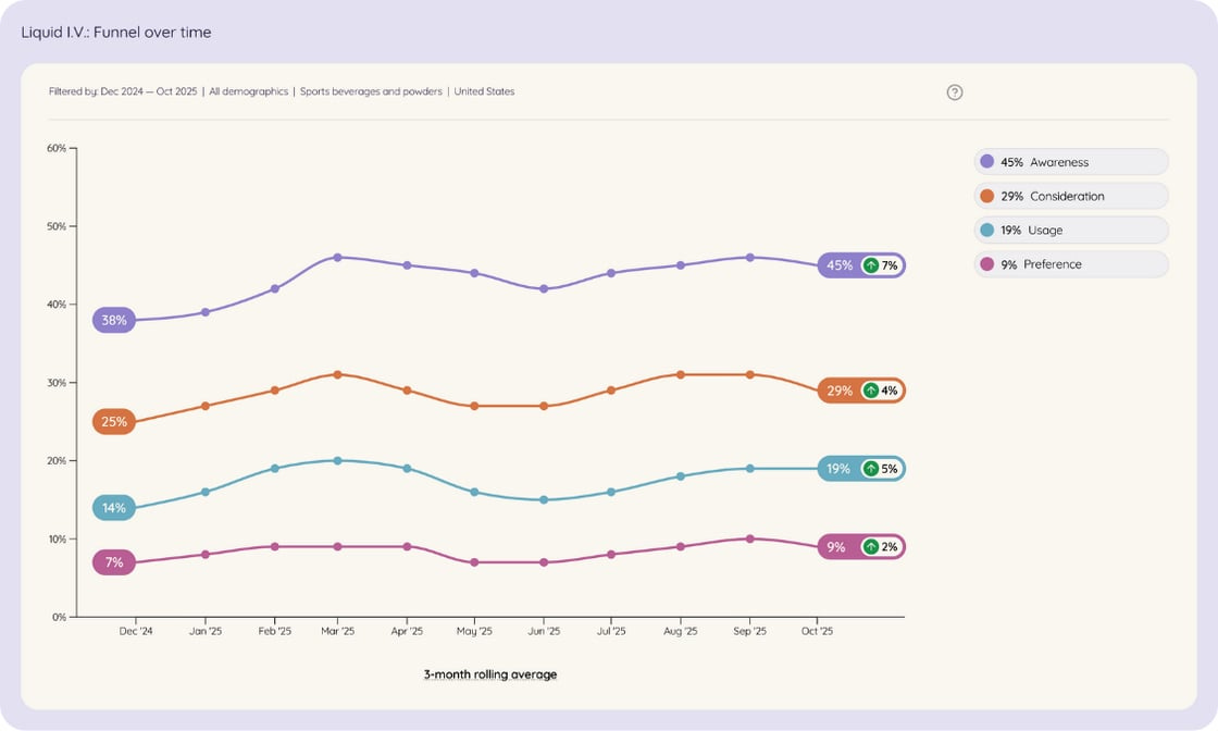According to Tracksuit data, between December 2024 and November 2025, within the Sports Beverages and Powders category, Liquid I.V. recorded growth across the entire funnel: awareness increased from 38% to 46%, consideration from 25% to 29%, claimed usage from 14% to 20%, and preference from 7% to 9%.
