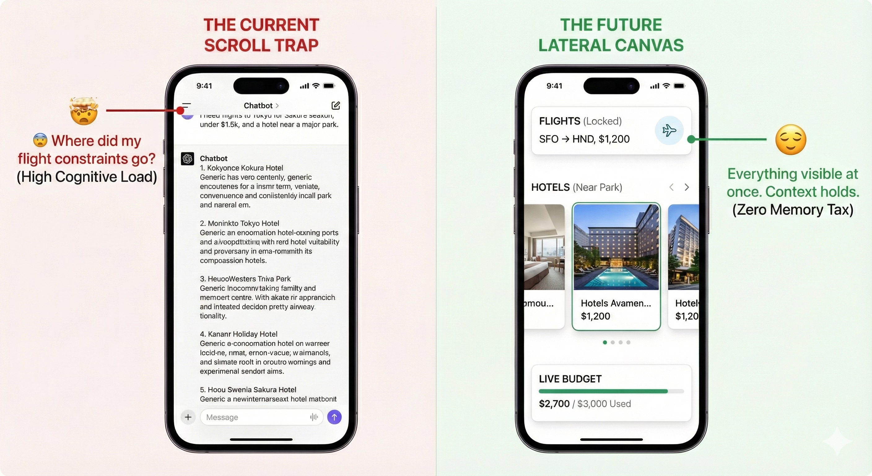 3. The Scroll trap (linear chat vs simultaneous reality): The final hurdle is keeping the pieces visible. Travel isn’t a linear to-do list; it is a simultaneous equation. Consider the ‘Swiftie test’. You are planning a trip from Seattle to London for the Eras Tour with strict variables: Concert seats in Section 120, a non-stop flight, and a hotel capped at $150/night – all while keeping the total budget under $3,000. Chat interfaces force these distinct variables into a single, vertical thread. As soon as you ask about the hotel, the flight details scroll off-screen. To compare options, you are forced to scroll up and down, relying on your own memory to stitch the trip together. It turns travel planning into a memory test because the UI cannot hold multiple truths (flight, hotel, event) visible at the same time. The Chat UI forces you to backtrack, scroll up, re-type prompts, and play 20 questions to see if a cheaper flight might save the budget.