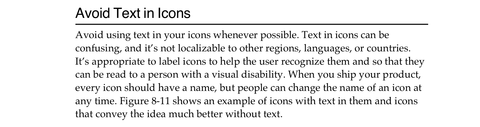But for this to work, the user must understand what’s drawn on the icon. It must be a familiar object with a clear translation to computer action (like Trash can → Delete), a widely used symbol, or an easy-to-understand diagram. HIG: