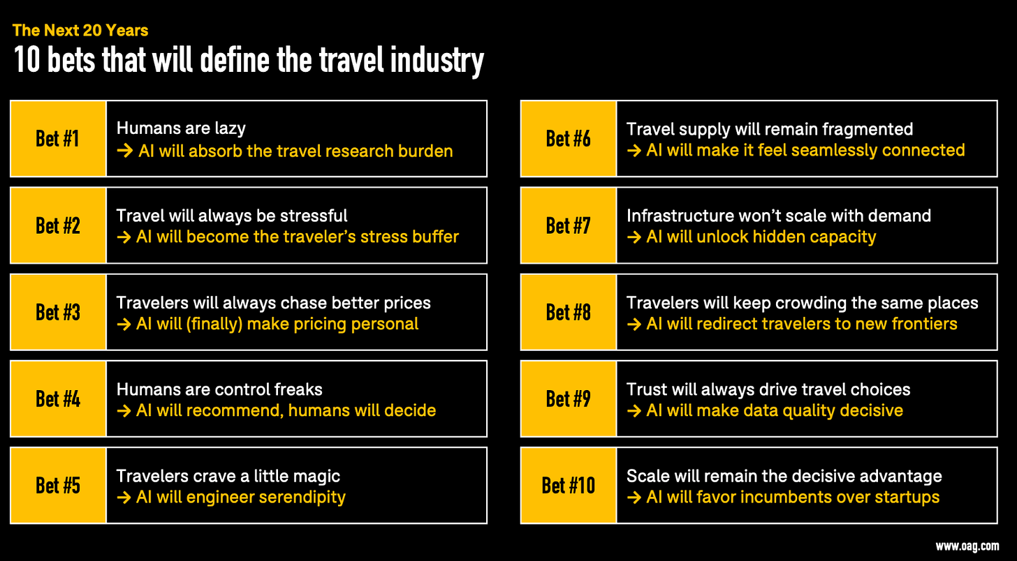 Instead of asking what will happen in 2026, OAG’s Travel 2045 report asks “Where will travel be in 20 years?” That long view forces sharper questions. What systems are becoming obsolete? What labor, infrastructure, and data dependencies are quietly breaking? Which categories haven’t been invented yet?